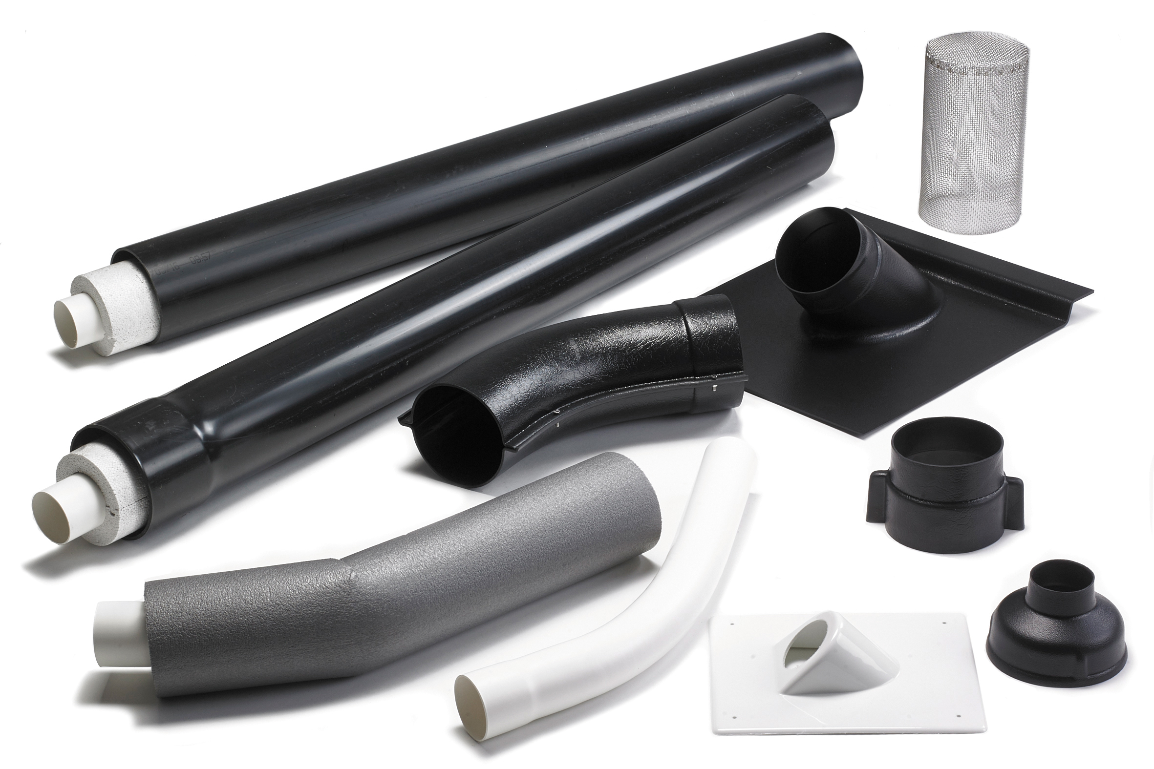 If you choose to go out through the wall, there is a ready-made kit as an extra accessory. Complete with loose pipes as needed. Contains: